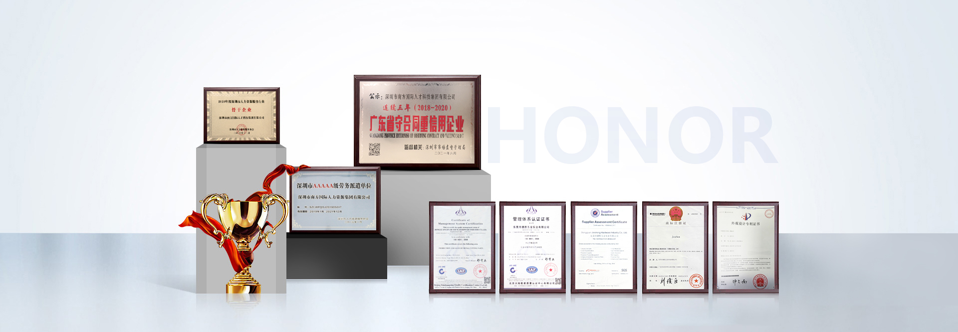 集团先后获得“全国诚信经营示范单位”、“广东省诚信示范企业”、“广东省守合同重信用企业”、“广东省人力资源诚信服务示范机构”、“深圳市人力资源服务骨干企业”等荣誉称号。